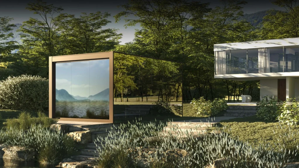 1. JEDINSTVENA PRIVATNOST: Fiksne bočne stijene izrađene su od kaljenog stakla (Spy Glass) s poliranim rubom i aluminijskim perimetralnim profilom, dostupne u dvije završne obrade: zrcalna (specchio) i dimljena siva (fumé). Ove stijene osiguravaju potpunu privatnost unutar pergole, dok istovremeno nude panoramski pogled prema van.