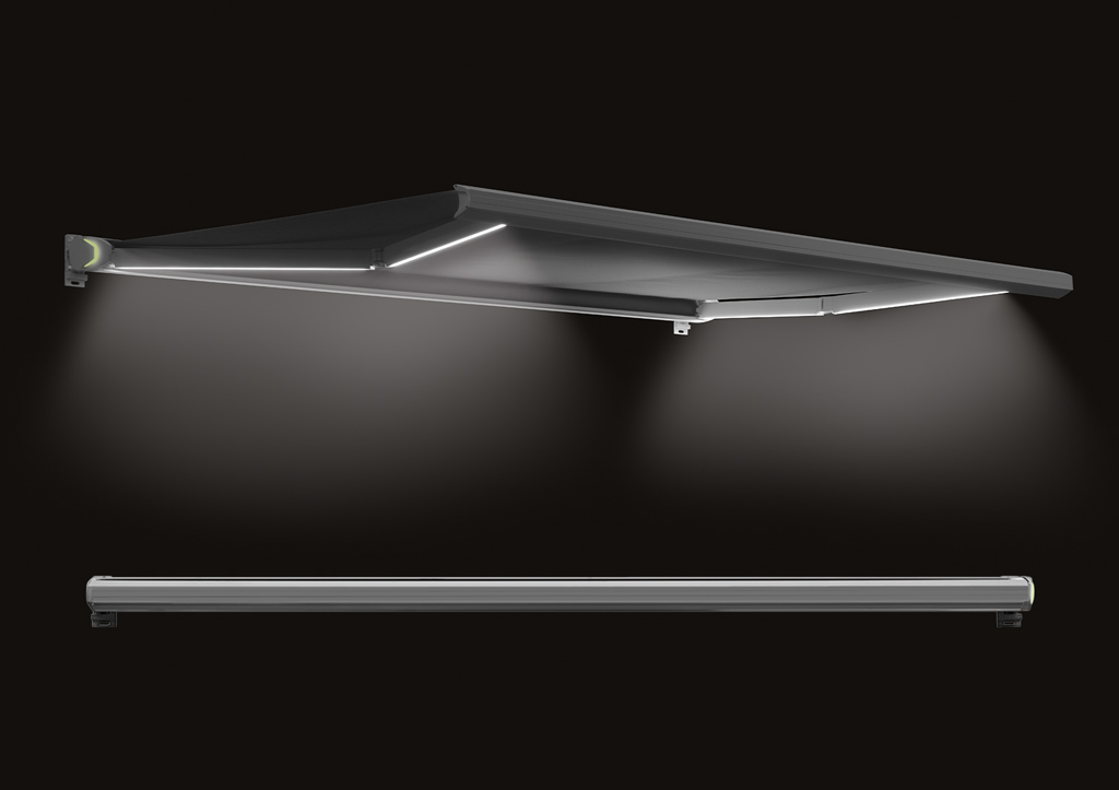 Mantegna Millennium – Lux je tenda s kaseton konstrukcijom koja kombinuje dizajn bočne RGB rasvjete (kao kod modela Special) s dodatnom instalacijom para LED ruku s bijelim dimabilnim svjetlom — za osvjetljavanje vanjskog prostora noću.
