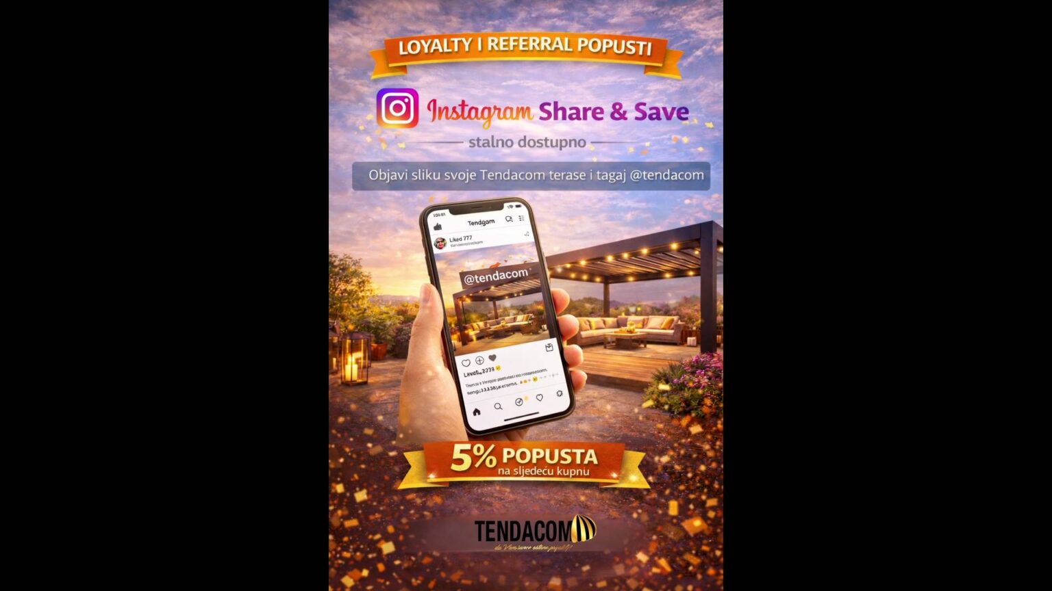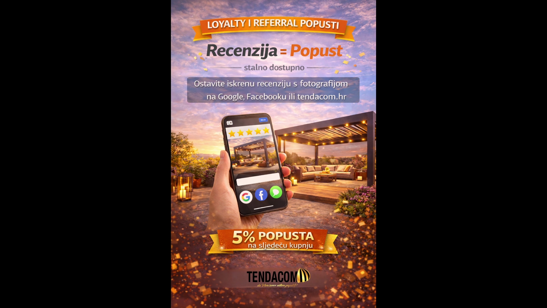 Za nove kupce pripremili smo Dobrodošli popust od 10%, a novi vlasnici kuće ili stana dobivaju čak 15% popusta uz dokaz o kupnji. Posebno mjesto u našem srcu imaju umirovljenici (15%) te vatrogasci, policajci, medicinsko osoblje i vojnici koji ostvaruju 12% popusta. Podijelite svoju terasu na Instagramu ili ostavite recenziju i zaradite 5% na sljedeću kupnju.