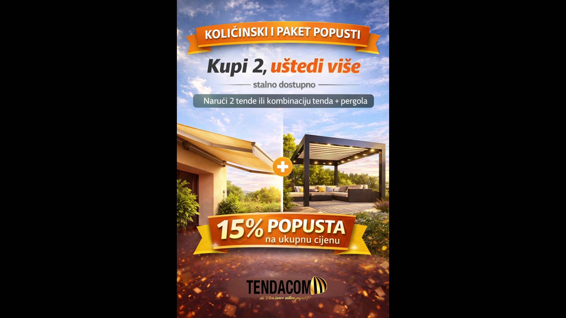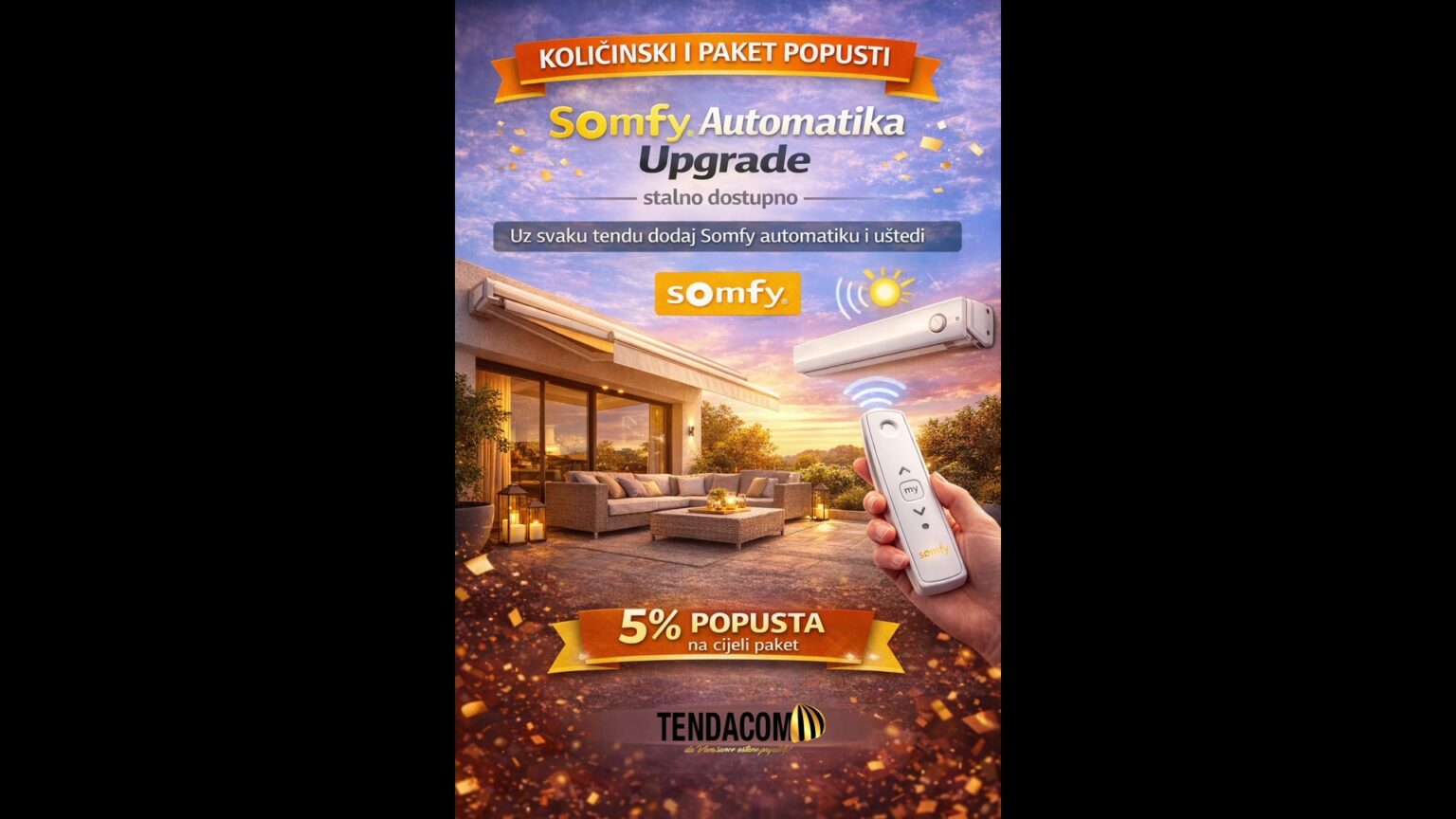 Nudimo količinske i paket popuste — naručite 2 tende ili kombinaciju tende i pergole i uštedite 15%, a ako organizirate narudžbu za cijelu zgradu (5+ stanova), popust raste na 20%. Uz svaku tendu možete dodati Somfy automatiku i ostvariti dodatnih 5% popusta na cijeli paket.